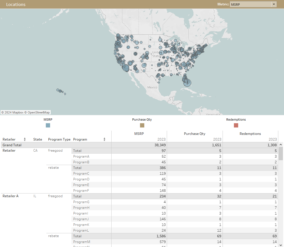 Bubble size reflects selected metric (MSRP, Purchase Qty, or Redemptions)