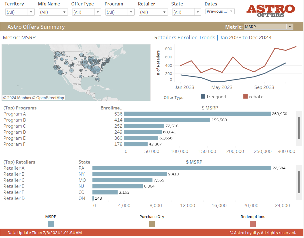 Provides a high-level overview of offer performance across retailers, programs, and geography.