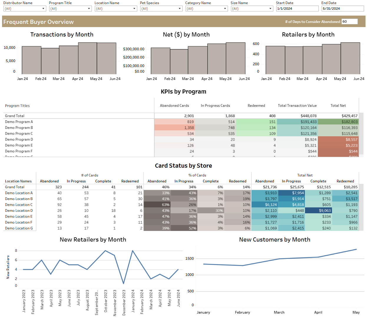 The Frequent Buyer Dashboard provides manufacturers with insight into how customers engage with frequent buyer programs over time. Unlike offer-based reports, this dashboard focuses on card progression, completion behavior, abandonment risk, and customer value driven by frequent buyer programs.