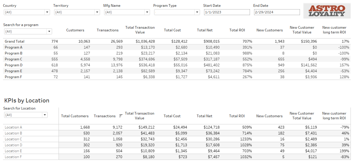 The New Customer Program ROI dashboard gives you a complete view of how your promotional programs drive new customer acquisition, retail sales value, and long-term return on investment. This report is designed specifically for manufacturers who want to evaluate how effectively their Astro Loyalty programs convert promotional spending into real, measurable business growth.